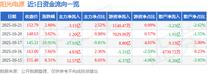 证券之星消息,截至2025年10月21日收盘,阳光电源(300274)报收于152.79元,上涨2.8%,换手率5.12%,成交量81.37万手,成交额123.37亿元。