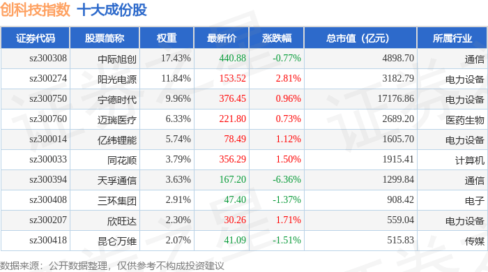 证券之星消息,10月23日,创科技(399276)指数报收于7420.72点,涨0.05%,成交674.35亿元,换手率2.23%。当日该指数成份股中,上涨的有28家,阳光电源以2.81%的涨幅领涨,下跌的有22家,天孚通信以6.36%的跌幅领跌。
