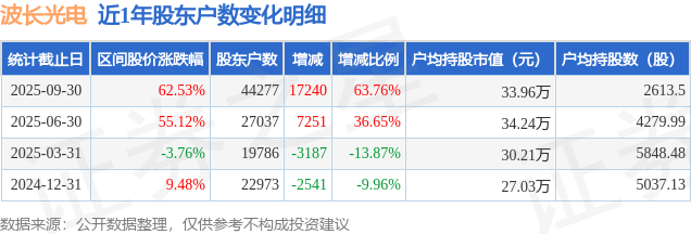从股价来看,2025年6月30日至2025年9月30日,波长光电区间涨幅为62.53%,在此期间股东户数增加1.72万户,增幅为63.76%。