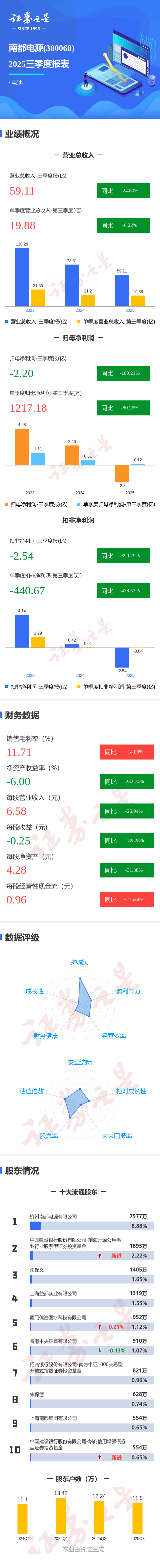 证券之星消息,南都电源2025年三季报显示,前三季度公司主营收入59.11亿元,同比下降24.8%;归母净利润-2.2亿元,同比下降189.22%;扣非净利润-2.54亿元,同比下降699.29%;其中2025年第三季度,公司单季度主营收入19.88亿元,同比下降6.22%;单季度归母净利润1217.18万元,同比下降80.26%;单季度扣非净利润-440.67万元,同比下降438.53%;负债率79.01%,投资收益-475.26万元,财务费用2.34亿元,毛利率11.71%。