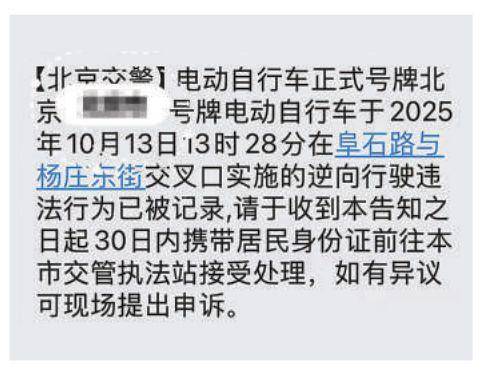 在某社交平台,有网友晒出10月14日收到的121231100号码显示为“北京交警”发送的短信,告知其电动自行车在阜石路与杨庄东街交叉口逆行被记录,需30日内携带身份证前往交管执法站接受处理,如有异议可现场提出申诉。