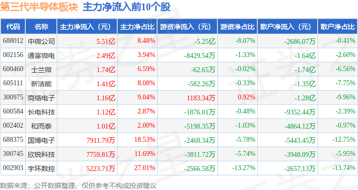 从资金流向上来看,当日第三代半导体板块主力资金净流出68.17亿元,游资资金净流入11.93亿元,散户资金净流入56.24亿元。第三代半导体板块个股资金流向见下表: