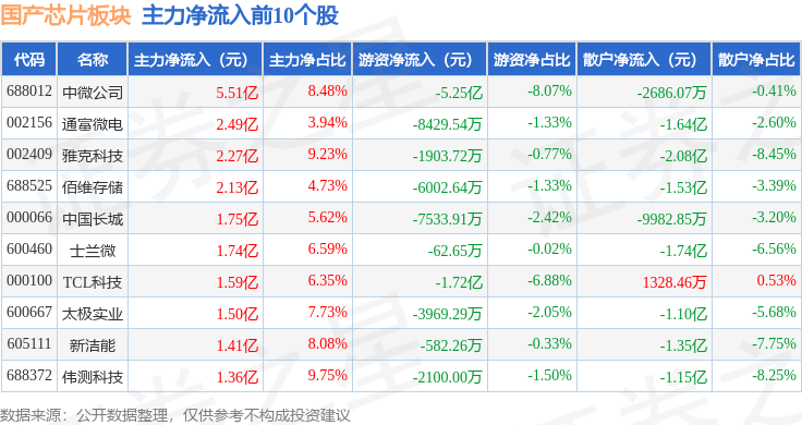 从资金流向上来看,当日国产芯片板块主力资金净流出198.96亿元,游资资金净流入78.71亿元,散户资金净流入120.25亿元。国产芯片板块个股资金流向见下表: