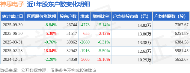 从股价来看,2025年6月30日至2025年9月30日,神思电子区间跌幅为8.84%,在此期间股东户数减少4773.0户,减幅为15.14%。