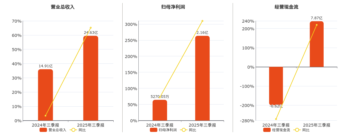 公司营业总收入为24.63亿元。归母净利润为2.16亿元。经营活动现金净流入为7.87亿元。