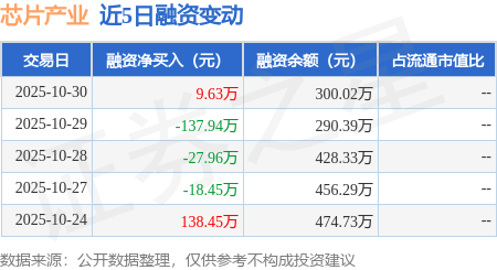 证券之星消息,10月30日,芯片产业(159310)融资买入97.1万元,融资偿还87.47万元,融资净买入9.63万元,融资余额300.02万元。