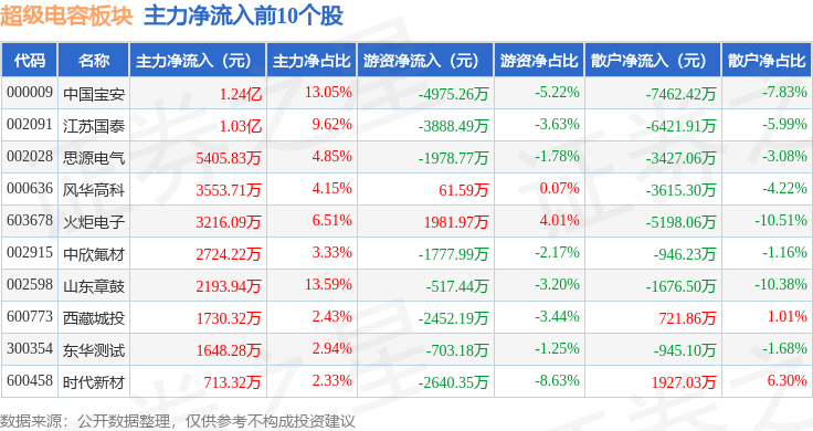 从资金流向上来看,当日超级电容板块主力资金净流出25.12亿元,游资资金净流入4.4亿元,散户资金净流入20.72亿元。超级电容板块个股资金流向见下表: