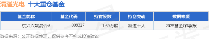 持有清溢光电最多的基金为东兴兴晟混合A,目前规模为0.21亿元,最新净值1.487(10月31日),较上一交易日上涨0.0%,近一年上涨34.89%。该基金现任基金经理为李晨辉 李兵伟。