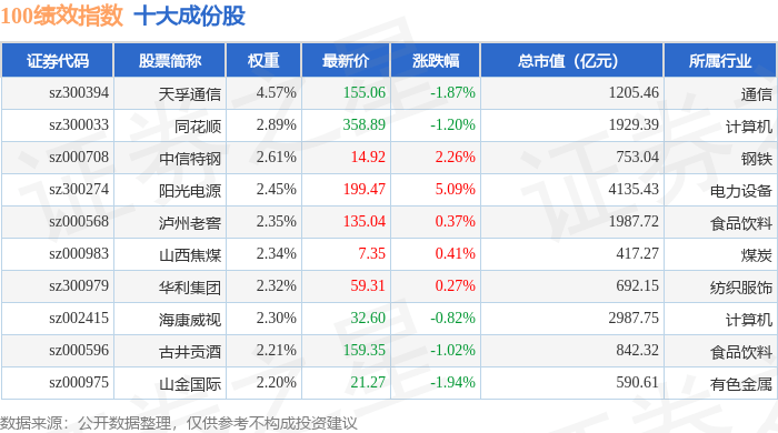 证券之星消息,11月3日,100绩效(399656)指数报收于6484.82点,涨0.09%,成交2250.17亿元,换手率1.14%。当日该指数成份股中,上涨的有56家,阳光电源以5.09%的涨幅领涨,下跌的有41家,长春高新以3.6%的跌幅领跌。