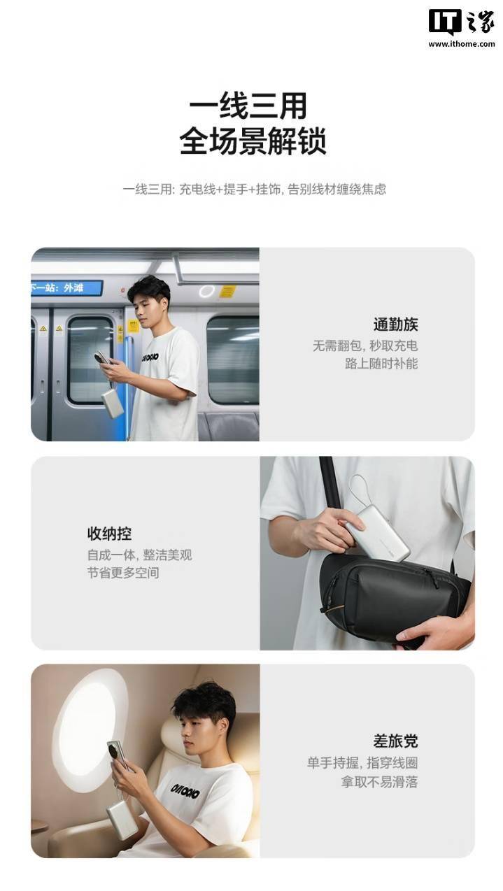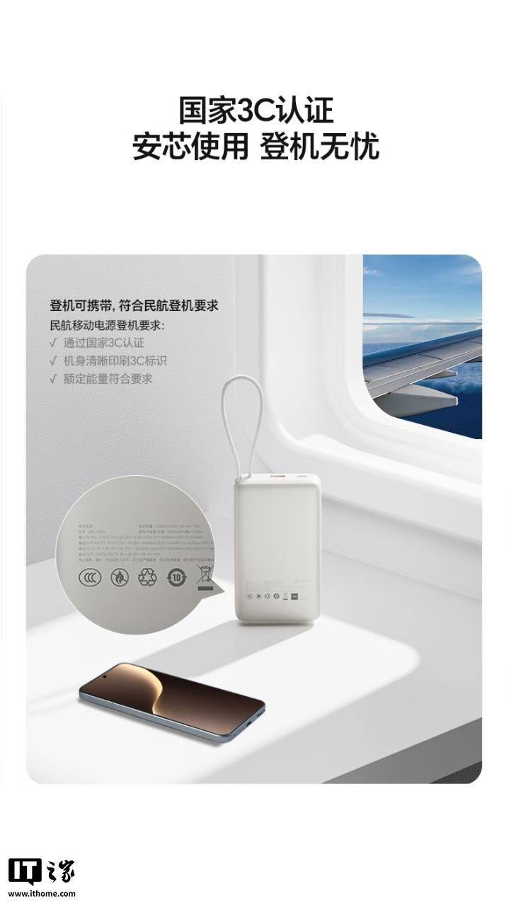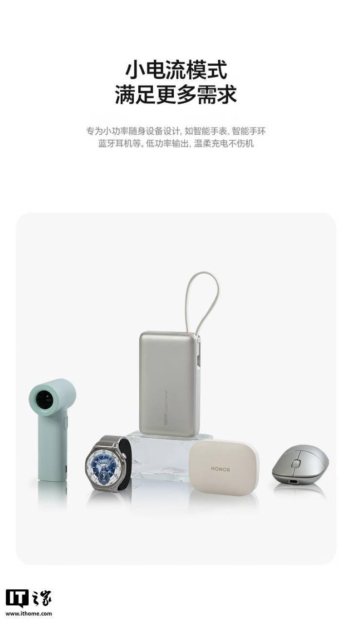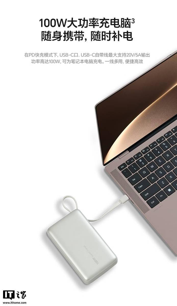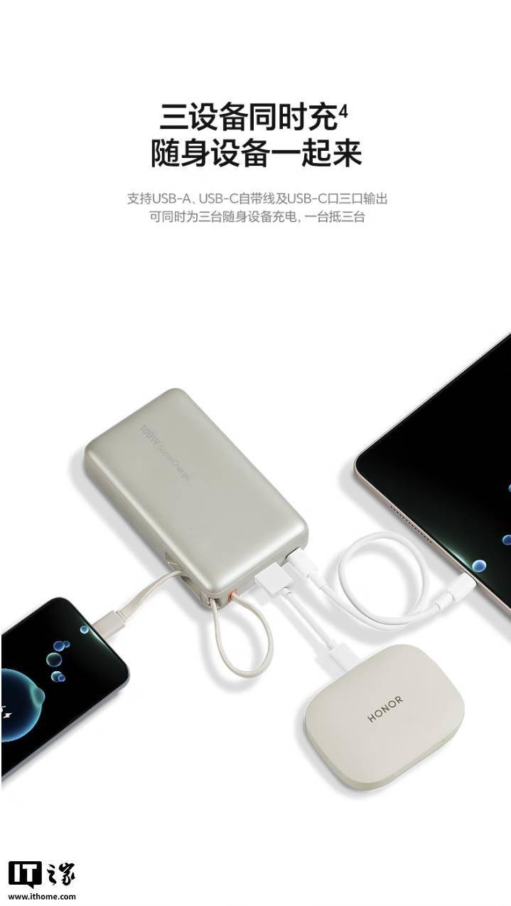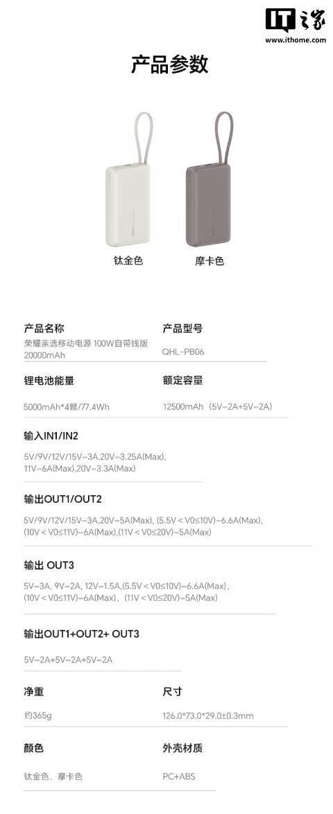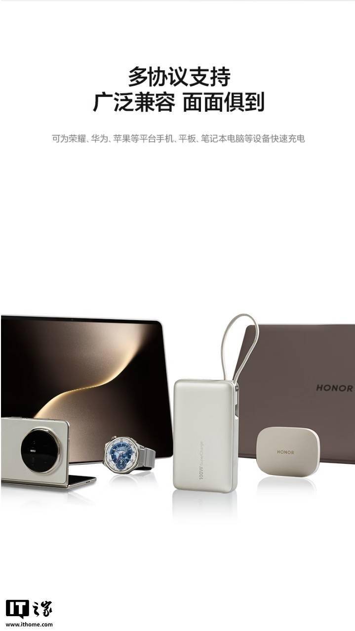 IT之家 11 月 3 日消息,荣耀亲选移动电源 100W 自带线版现已开售,容量达 20000mAh,支持 SCP、PD 双模式 100W 快充,采用自带挂绳设计,通过双 3C 认证,可带上飞机。