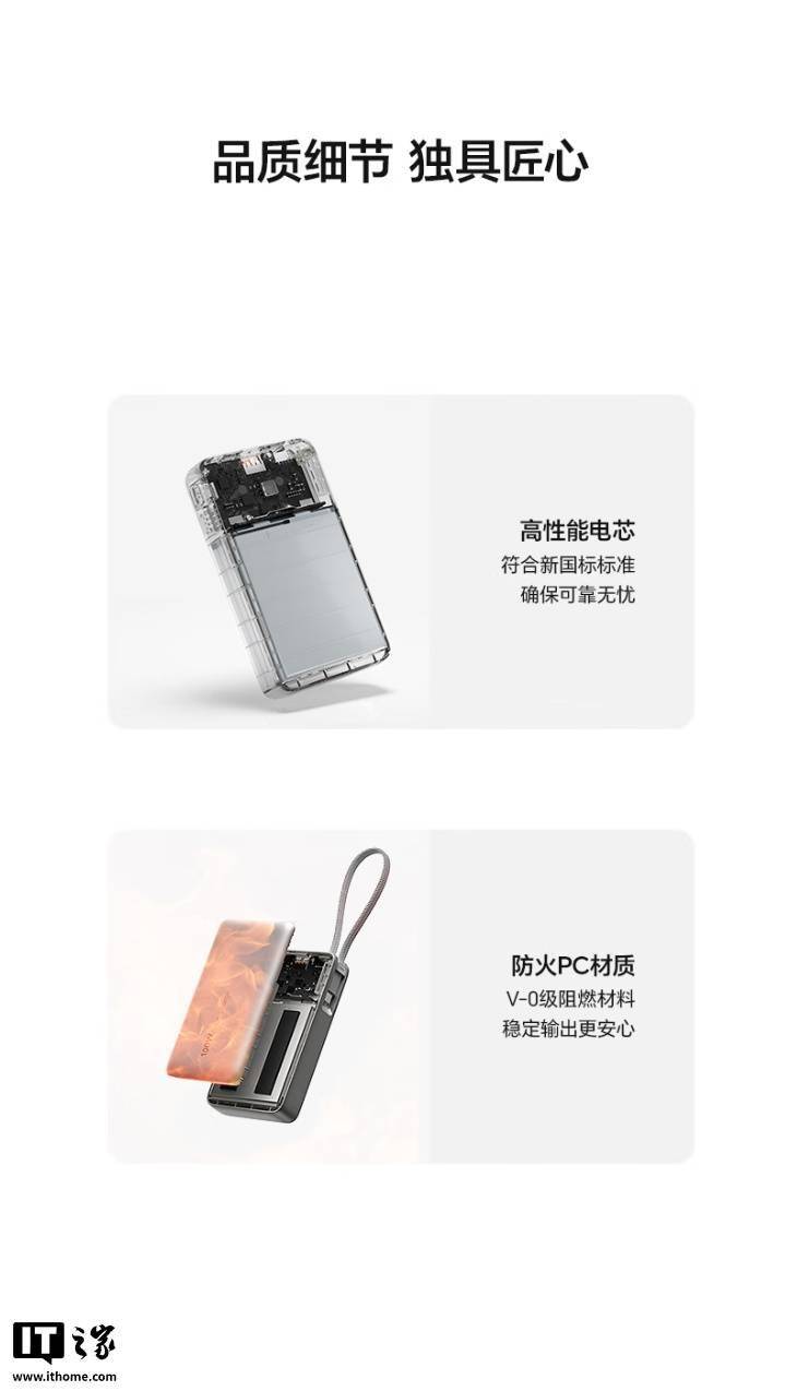 此外,这款充电宝的外壳采用防火 PC 材质,可选钛金色、摩卡色两种配色。