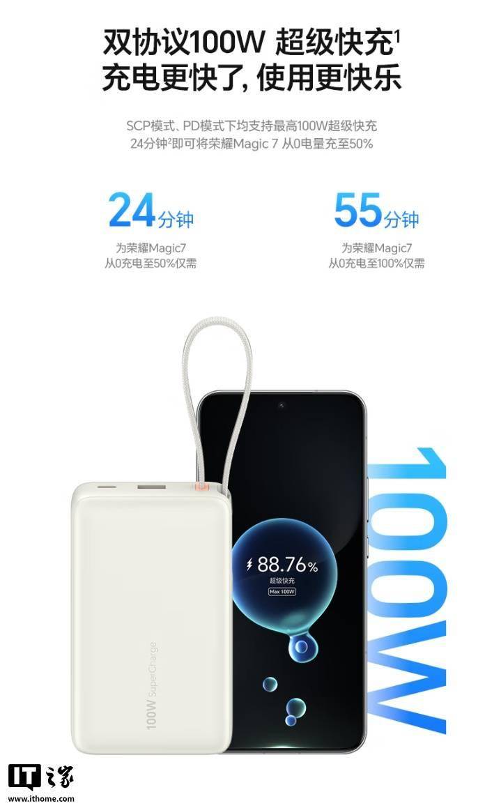 据介绍,这款移动电源自带有 1 个 USB-A、1 个 USB-C 接口,同时自带一个双向 USB-C 线,SCP、PD 模式下均支持 100W 超级快充,号称可在 24 分钟内将荣耀 Magic 7 手机充至 50% 电量,自带线端和 USB-C 端均支持 20V / 5A 输出,可为笔记本充电。