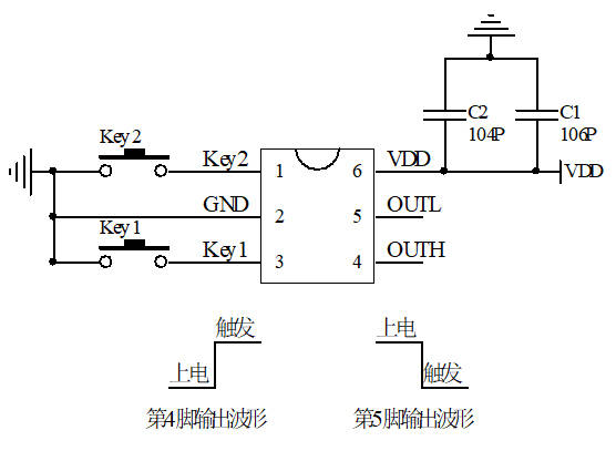 两按键(KEY1、KEY2)输入控制,两路信号同步输出,上电OUTL输出高电平、OUTH输出低电平。
