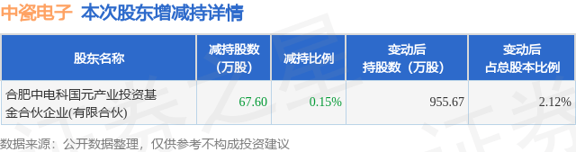 证券之星消息,11月4日中瓷电子发布公告《中瓷电子:关于公司股东减持计划时间届满暨减持股份结果的公告》,其股东合肥中电科国元产业投资基金合伙企业(有限合伙)于2025年9月18日至2025年11月3日间合计减持67.6万股,占公司目前总股本的0.1499%,变动期间该股股价下跌6.86%,截止11月3日收盘报56.31元。