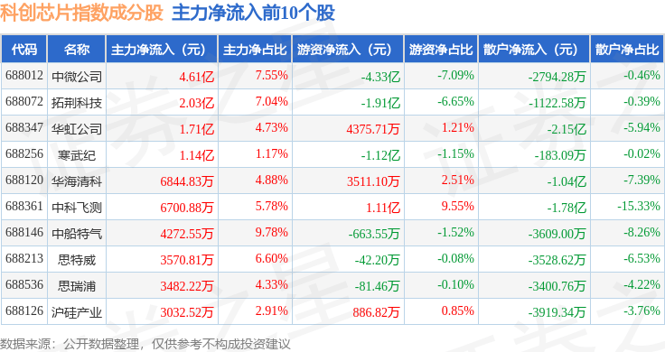 资金流向方面,科创芯片(000685)指数成份股当日主力资金净流出合计2.17亿元,游资资金净流入合计3.42亿元,散户资金净流出合计1.25亿元。成份股资金流向详情见下表: