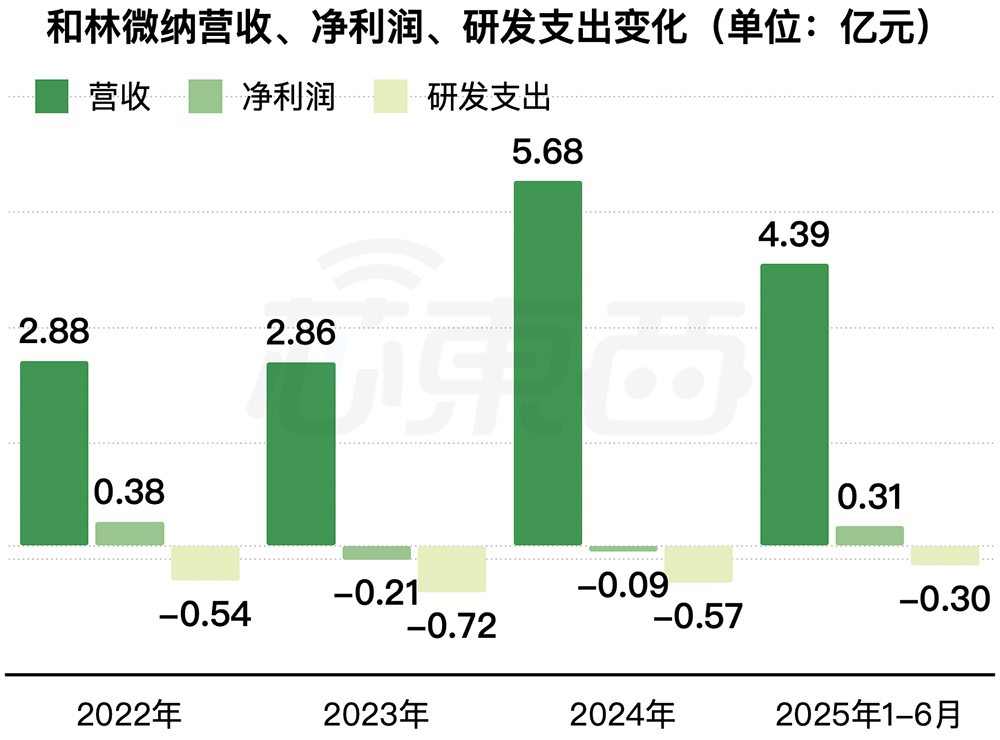 2022年、2023年、2024年、2025年1-6月,和林微纳收入分别为2.88亿元、2.86亿元、5.68亿元、4.39亿元,净利润分别为0.38亿元、-0.21亿元、-0.09亿元、0.31亿元,研发费用分别为0.54亿元、0.72亿元、0.57亿元、0.30亿元。