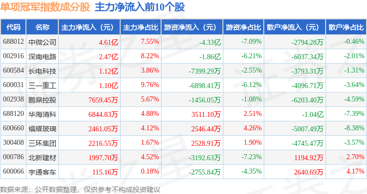 资金流向方面,单项冠军(980150)指数成份股当日主力资金净流出合计103.89亿元,游资资金净流入合计27.72亿元,散户资金净流入合计76.17亿元。成份股资金流向详情见下表: