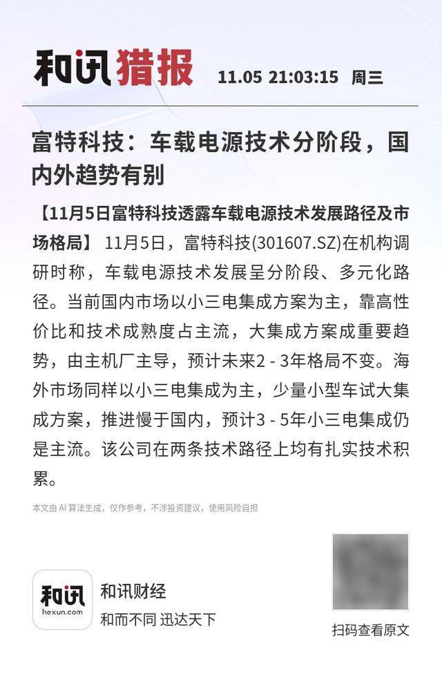 【11月5日富特科技透露车载电源技术发展路径及市场格局】11月5日,富特科技(301607.SZ)在机构调研时称,车载电源技术发展呈分阶段、多元化路径。当前国内市场以小三电集成方案为主,靠高性价比和技术成熟度占主流,大集成方案成重要趋势,由主机厂主导,预计未来2 - 3年格局不变。海外市场同样以小三电集成为主,少量小型车试大集成方案,推进慢于国内,预计3 - 5年小三电集成仍是主流。该公司在两条技术路径上均有扎实技术积累。