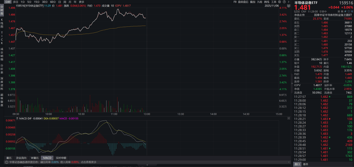 11月6日,聚焦上游半导体设备领域的半导体设备ETF(159516)大涨超3%。资金持续抢筹,半导体设备ETF(159516)年初以来份额增长近200%,当前规模超70亿元,居同类产品第一。