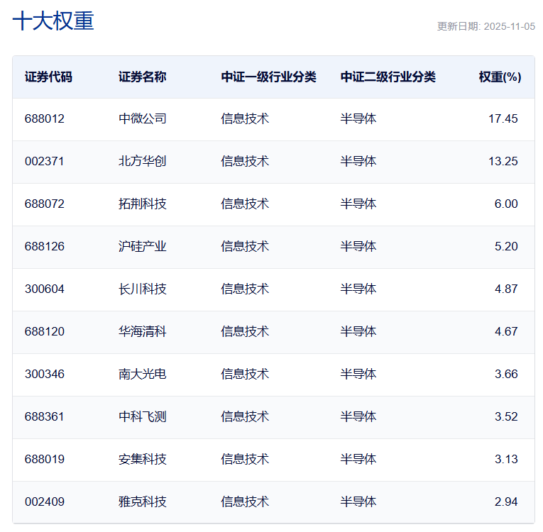 注:数据来源ifind,截至2025.11.5,半导体设备ETF规模为72.05亿,在同类6只产品中排名第一。