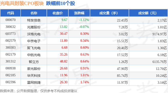 证券之星消息,11月6日光电共封装CPO板块较上一交易日上涨3.75%,源杰科技领涨。当日上证指数报收于4007.76,上涨0.97%。深证成指报收于13452.42,上涨1.73%。光电共封装CPO板块个股涨跌见下表: