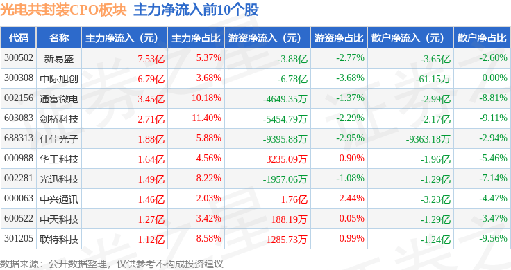 从资金流向上来看,当日光电共封装CPO板块主力资金净流入34.02亿元,游资资金净流出12.84亿元,散户资金净流出21.18亿元。光电共封装CPO板块个股资金流向见下表: