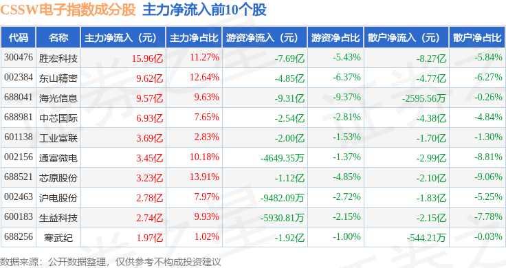 资金流向方面,CSSW电子(399811)指数成份股当日主力资金净流入合计75.66亿元,游资资金净流出合计38.71亿元,散户资金净流出合计36.95亿元。成份股资金流向详情见下表: