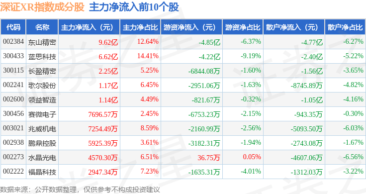 资金流向方面,深证XR(970046)指数成份股当日主力资金净流入合计2.21亿元,游资资金净流出合计7.93亿元,散户资金净流入合计5.72亿元。成份股资金流向详情见下表: