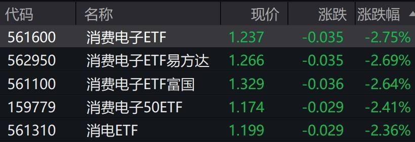 受盘面影响,多只跟踪中证消费电子主题指数的ETF跌超2%。