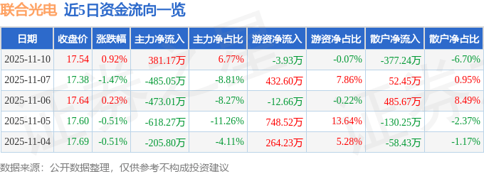 证券之星消息,截至2025年11月10日收盘,联合光电(300691)报收于17.54元,上涨0.92%,换手率1.46%,成交量3.23万手,成交额5633.01万元。
