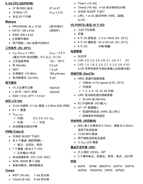 低电压检测LVD: 1.2V/2.0V2.4V/2.7V/3.0V/3.3V/3.6/4.0V或者外部输入电压
