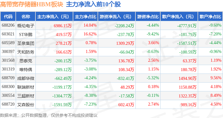 从资金流向上来看,当日高带宽存储器HBM板块主力资金净流出34.25亿元,游资资金净流入12.1亿元,散户资金净流入22.15亿元。高带宽存储器HBM板块个股资金流向见下表: