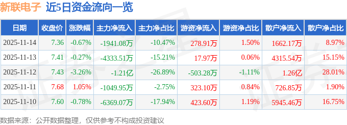 证券之星消息,截至2025年11月14日收盘,新联电子(002546)报收于7.36元,下跌0.67%,换手率3.12%,成交量24.98万手,成交额1.85亿元。