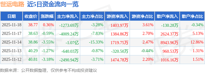 证券之星消息,截至2025年11月18日收盘,世运电路(603920)报收于38.77元,上涨0.36%,换手率1.39%,成交量10.04万手,成交额3.89亿元。