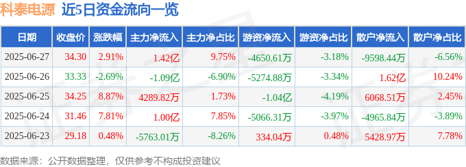 证券之星消息,截至2025年6月27日收盘,科泰电源(300153)报收于34.3元,上涨2.91%,换手率13.46%,成交量42.83万手,成交额14.62亿元。