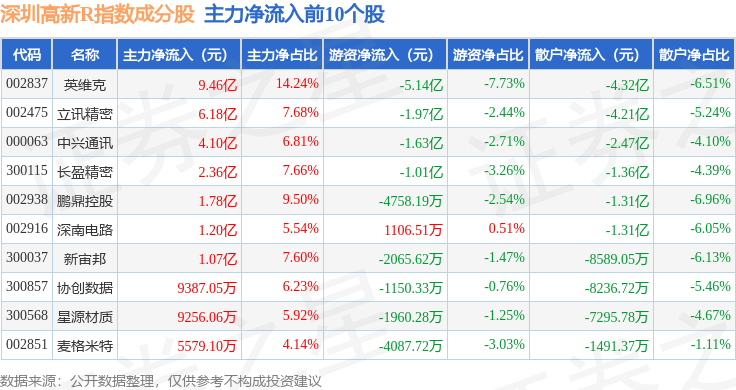 资金流向方面,深圳高新R(480038)指数成份股当日主力资金净流入合计25.67亿元,游资资金净流出合计9.17亿元,散户资金净流出合计16.5亿元。成份股资金流向详情见下表: