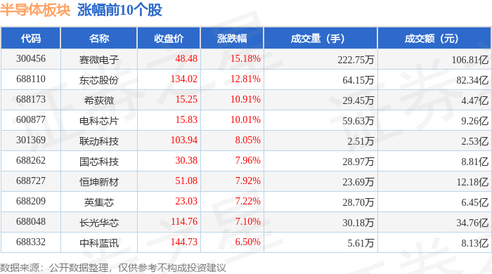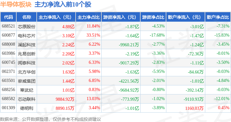从资金流向上来看,当日半导体板块主力资金净流入3.12亿元,游资资金净流出3.94亿元,散户资金净流入8245.04万元。半导体板块个股资金流向见下表:
