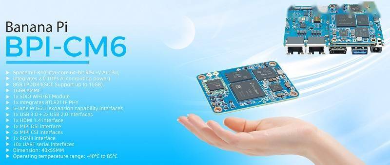 在配置方面,BPI-CM6 搭载了进迭时空(SpacemiT)K1 处理器(SoC),该芯片基于开源的 RISC-V 架构构建。图形处理方面集成了 Imagination IMG BXE-2-32 GPU,支持 Vulkan 1.3 和 OpenGL ES 3.2 标准。