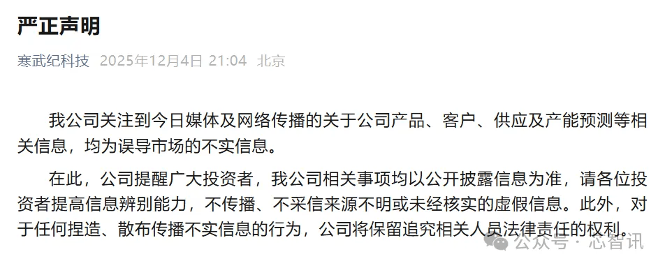 寒武纪还表示:“在此,公司提醒广大投资者,我公司相关事项均以公开披露信息为准,请各位投资者提高信息辨别能力,不传播、不采信来源不明或未经核实的虚假信息。此外,对于任何捏造、散布传播不实信息的行为,公司将保留追究相关人员法律责任的权利。”