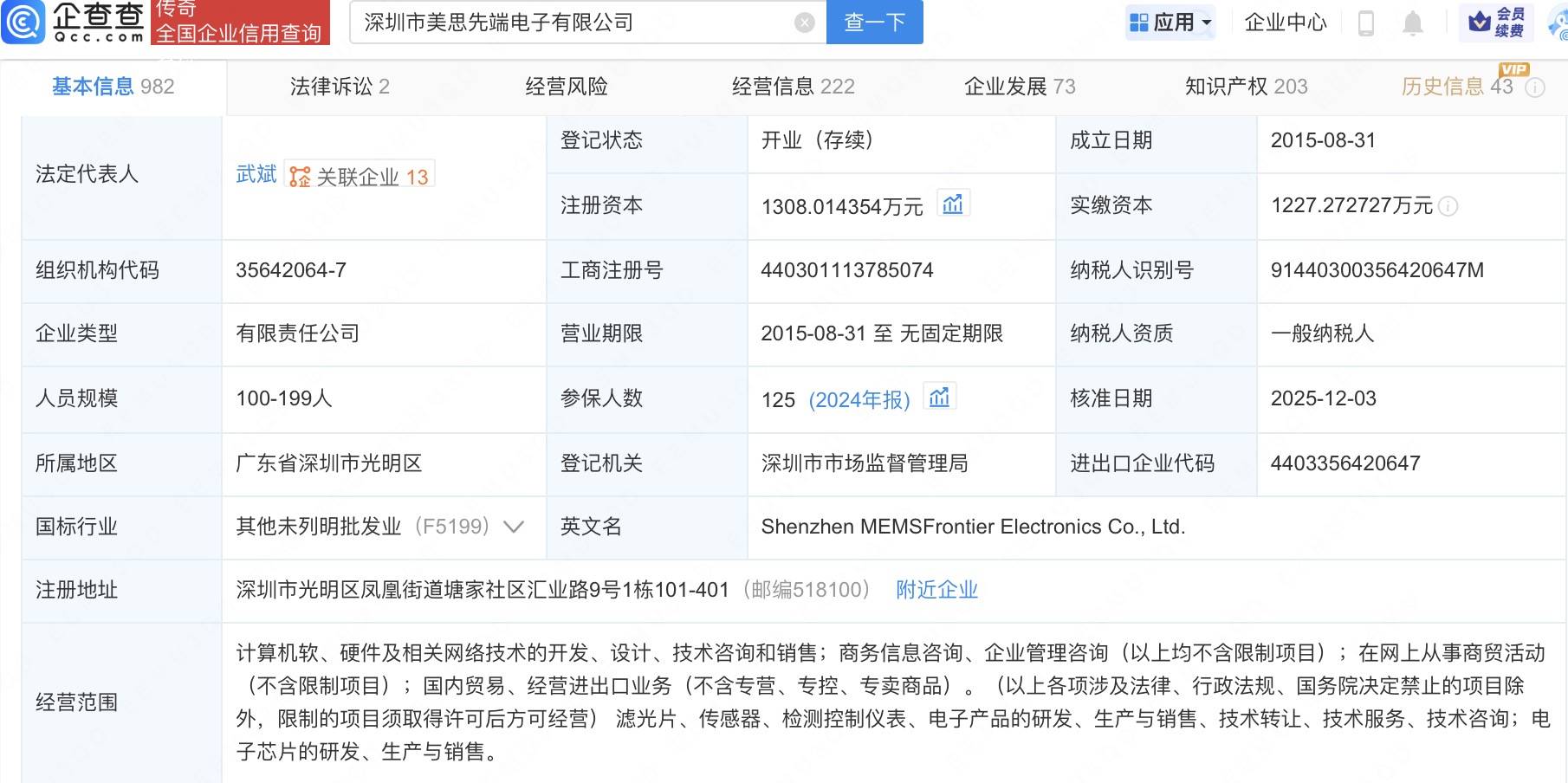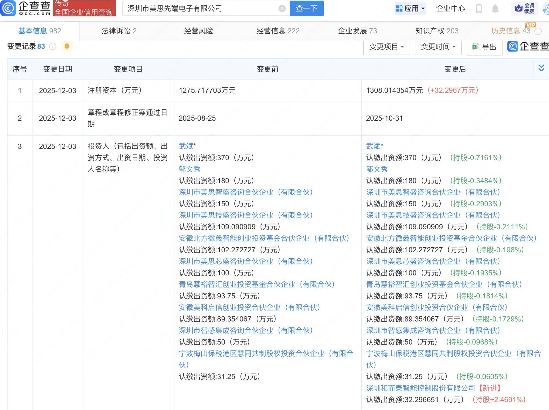 企查查APP显示,近日,深圳市美思先端电子有限公司发生工商变更,新增和而泰(002402)为股东,同时注册资本增至1308.01万元。企查查信息显示,该公司成立于2015年,法定代表人为武斌。公开信息显示,美思先端是MEMS传感器与精密光学设计制造高新技术企业,致力于提供优质的智能传感器、光学组件与行业应用解决方案。