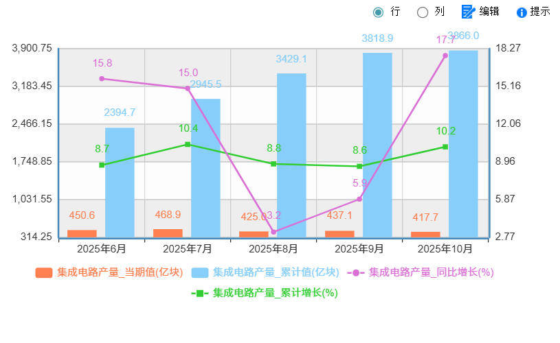 根据国家统计局的数据显示,1-10月份,中国一共生产芯片3866亿块,同比增长了10.2%。