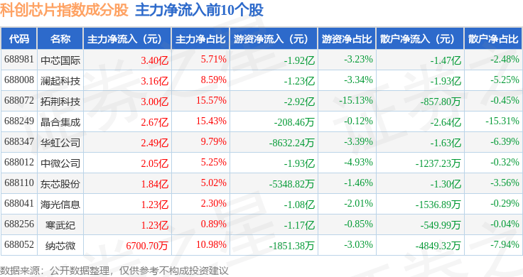 资金流向方面,科创芯片(000685)指数成份股当日主力资金净流入合计20.01亿元,游资资金净流出合计15.68亿元,散户资金净流出合计4.33亿元。成份股资金流向详情见下表: