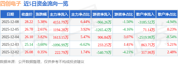 证券之星消息,截至2025年12月8日收盘,四创电子(600990)报收于28.22元,上涨5.38%,换手率8.59%,成交量23.1万手,成交额6.44亿元。