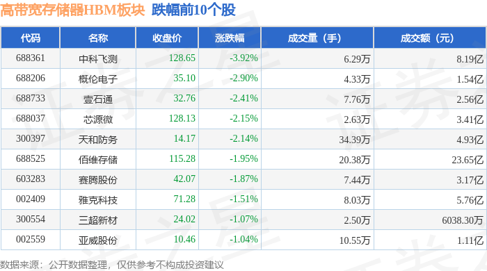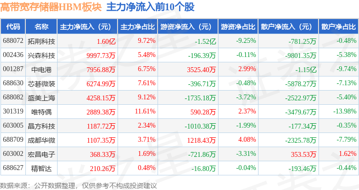 从资金流向上来看,当日高带宽存储器HBM板块主力资金净流出2.8亿元,游资资金净流出4956.62万元,散户资金净流入3.29亿元。高带宽存储器HBM板块个股资金流向见下表: