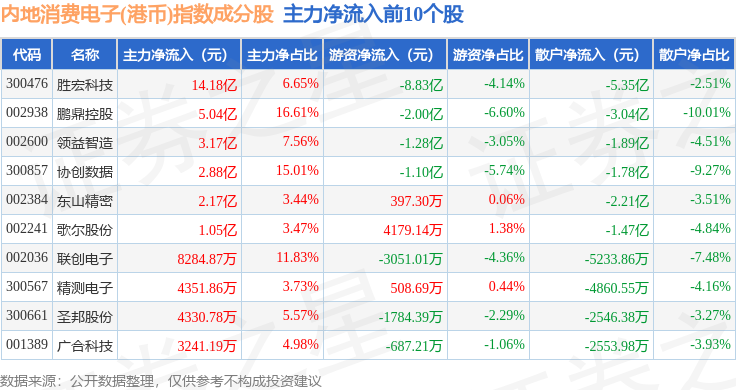资金流向方面,内地消费电子(港币)(983106)指数成份股当日主力资金净流入合计8.55亿元,游资资金净流出合计6.76亿元,散户资金净流出合计1.79亿元。成份股资金流向详情见下表:
