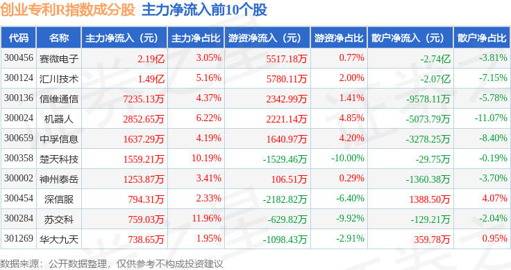 资金流向方面,创业专利R(470068)指数成份股当日主力资金净流出合计35.05亿元,游资资金净流入合计10.08亿元,散户资金净流入合计24.97亿元。成份股资金流向详情见下表: