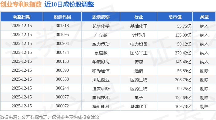 近10日内创业专利R(470068)指数成份股做了调整,新纳入了5只股票,剔除了5只股票。