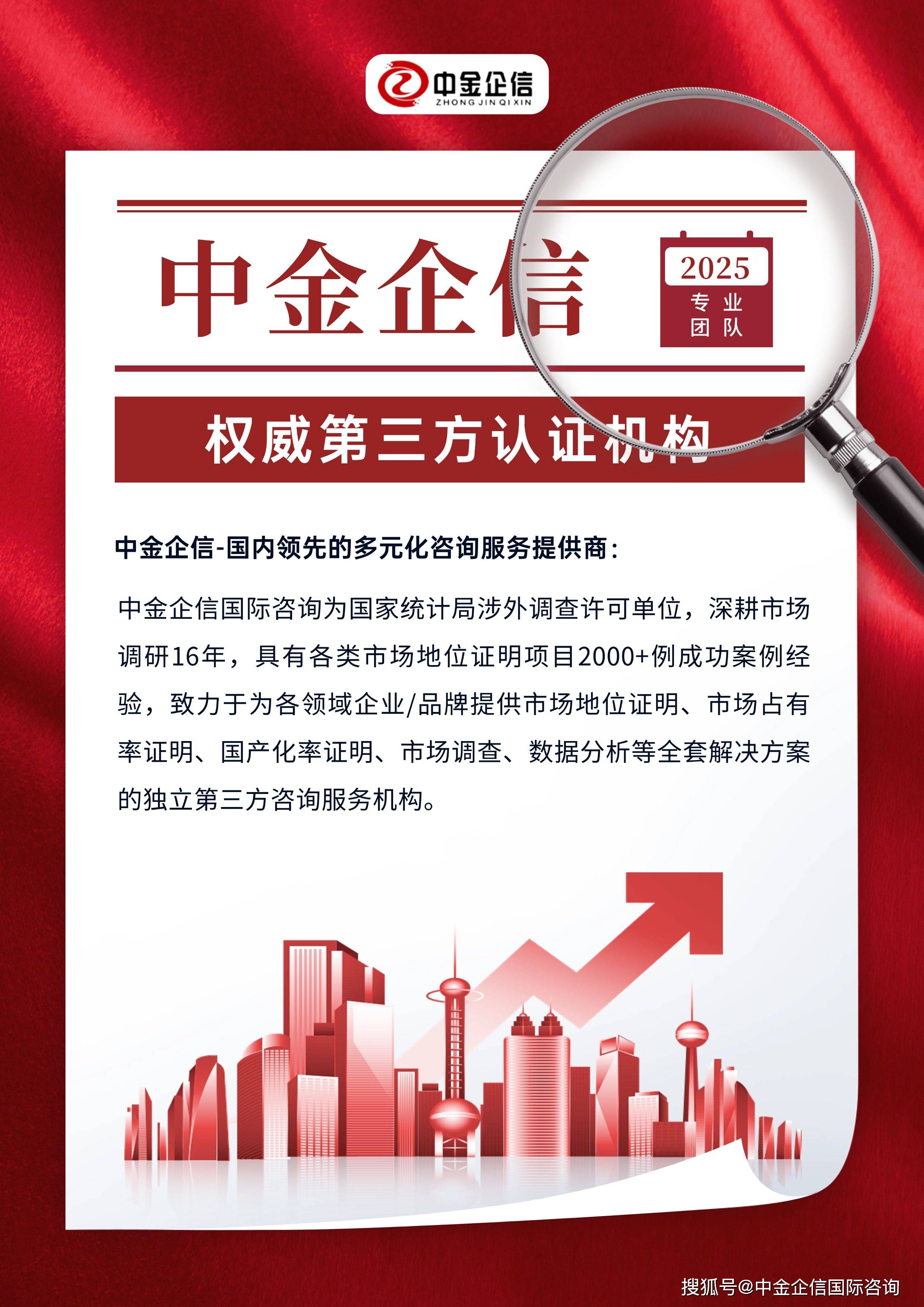中金企信(北京)国际信息咨询有限公司(简称:中金企信;中金企信国际咨询)成立于2010年,总部位于北京,全国多个城市设有联络处及外派人员。中金企信为国家统计局涉外调查许可单位&AAA企业信用机构&中国认证认可协会会员单位&重合同守信用单位&重质量服务信誉单位&诚信经营示范单位等荣誉机构,致力于为国内外“政府部门/机构组织/各领域企业等提供战略咨询、产业规划、市场调查、市场地位认证/证明、市场占有率证明、国产化率认证、品牌价值评估、问卷评估、进入性研究、数据分析、定制报告、项目可行性/商业计划书、行业研究等全套解决方案”的专业咨询顾问机构。