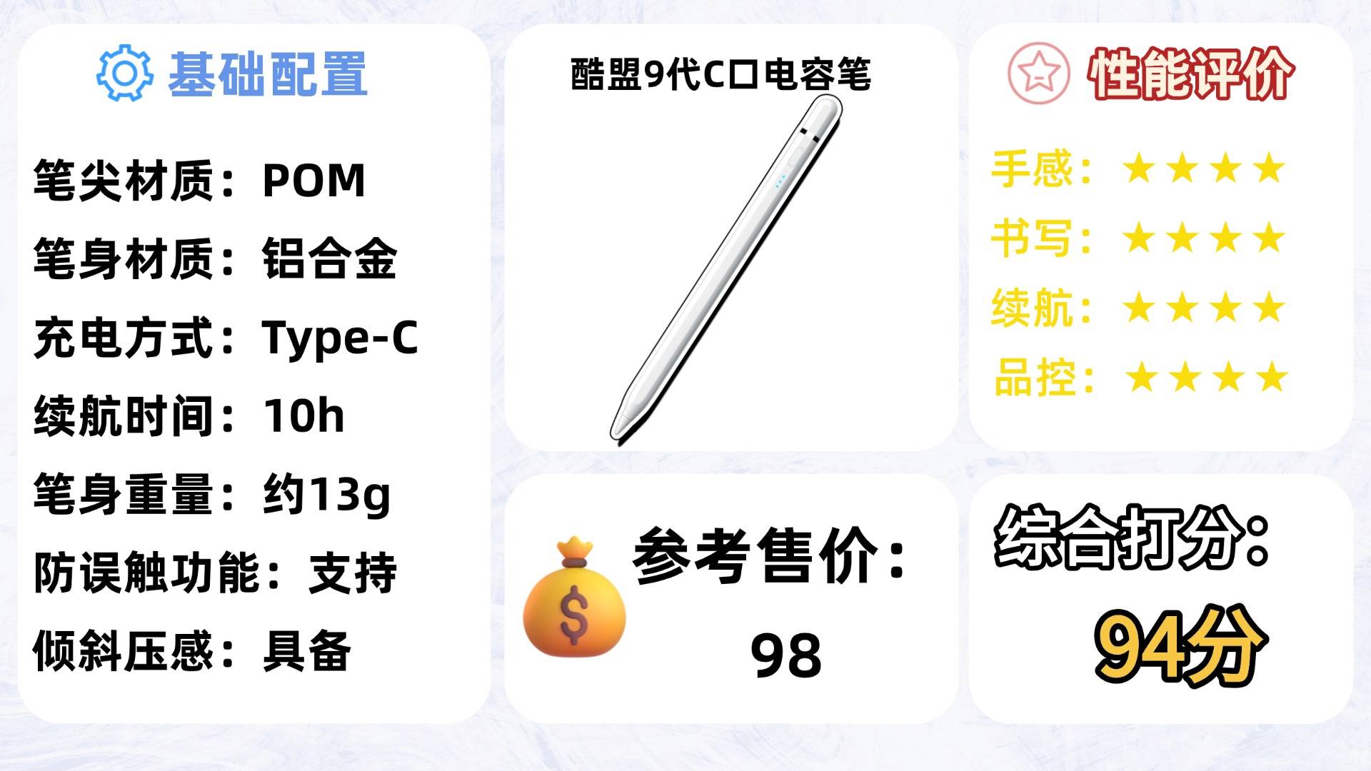 电容笔哪个性价比高又好用?10.酷-盟9代C口电容笔