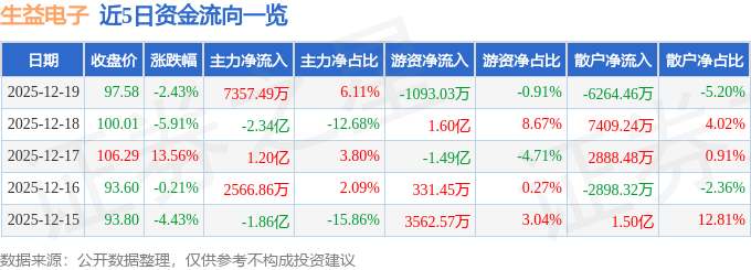 证券之星消息,截至2025年12月19日收盘,生益电子(688183)报收于97.58元,下跌2.43%,换手率1.46%,成交量12.11万手,成交额12.05亿元。